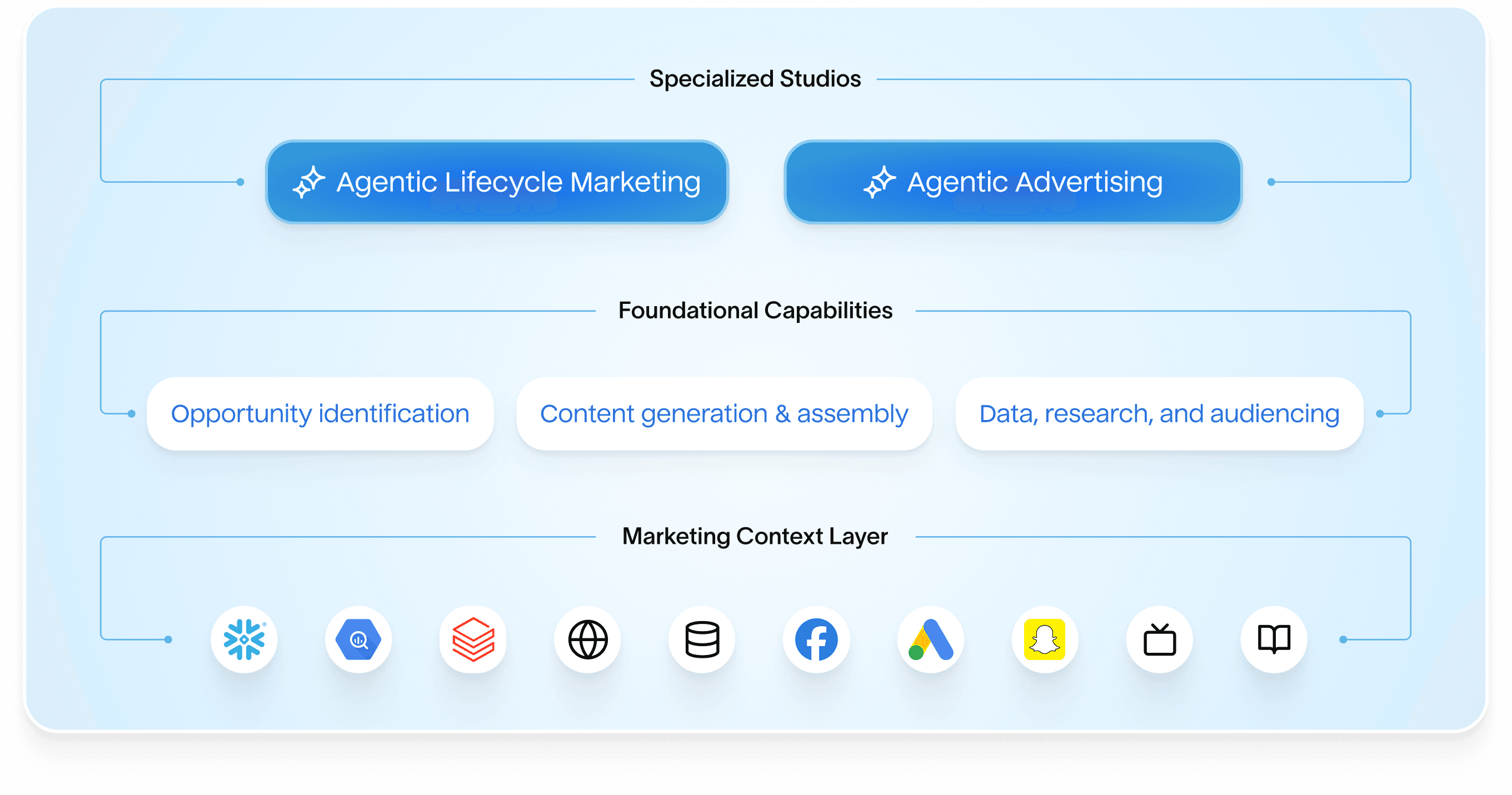At the core of the platform is the Marketing Context Layer. It brings together customer data, past campaigns, creative assets, brand guidelines, and performance history so agents can make decisions grounded in how the business actually operates. The platform connects to the systems marketers already use—data warehouses, lifecycle tools, ad platforms, and creative systems like DAMs—and builds a persistent understanding of brand voice, historical performance, and how campaigns move from idea to approval.