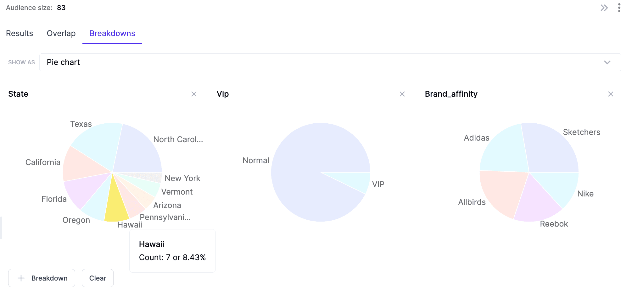 With Breakdowns, you can now easily create visuals to quickly understand the distribution of fields like State and VIP status as you build your audience segmentation.