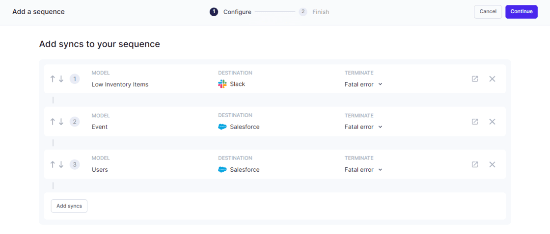 Sync Sequences: You can schedule your syncs to run sequentially in a specific linear order. Your syncs can be triggered to run upon the successful completion of another sync or dbt cloud job.