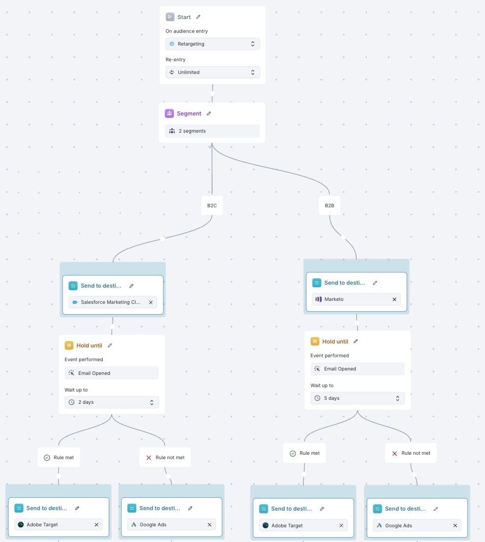 Another unexpected use case we have discovered is organizations using Hightouch to build omnichannel journeys using both Salesforce and Adobe marketing activations. Both marketing suites can create customer journeys that include onsite messaging, email, and digital advertising, but they can’t always take action using tools in the competing marketing suite. Hightouch can build journeys that span across Salesforce and Adobe tools (as well as all other tools you use).