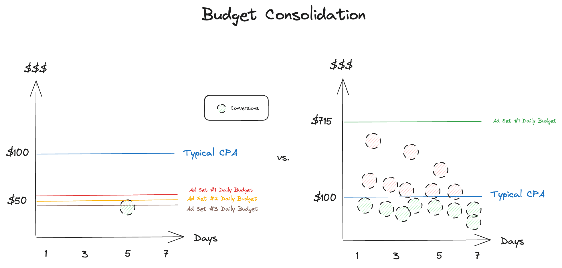 - Optimize Ad Set Budget: Allocating enough budget is critical to getting out of the Learning Phase. Consider this scenario: if your typical CPA is $100 and the daily budget across your new ad sets is a mere $50 each, you’ll likely never exit the Learning Phase. Instead, you should consolidate your ad sets into one and allocate a budget of at least $5,000 ($100 CPA x 50 conversions) per week per ad set (~$715 per day) to exit the Learning Phase smoothly. Ideally, advertisers consolidate as much budget as possible into an ad set until they can meet the optimal conversion threshold defined earlier. This not only ensures your campaigns gain momentum but also allows you to transition out of the Learning Phase swiftly.
