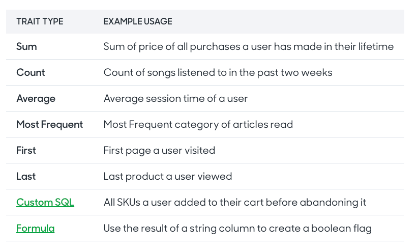 Another advantage of routing event data through the warehouse before sending it to SaaS products is creating new events and properties based on existing data. I think of these as “computed” events and properties since they use formulas to create new events and properties based on event data flowing in and existing data in the warehouse. In Hightouch, these “computed” events and properties are called Traits. Hightouch Traits can use any of the following functions: