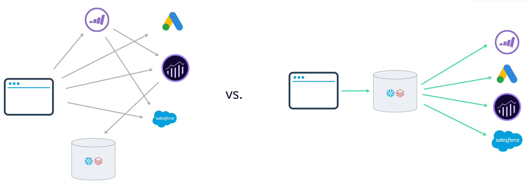 Companies often send data to each tool via one-off solutions. The one-off approach works fine initially but can quickly turn your tech stack into a complicated spiderweb of interdependent data pipelines and SDKs. You wind up with many tags on your website, sending data to many tools, and the data in one tool never matches the data in another.