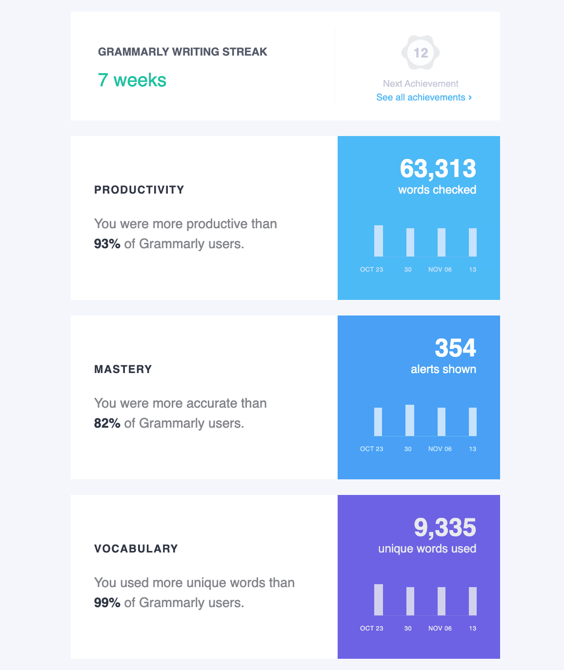 One of my favorites, for example, is from our customer Grammarly - the world's leading AI writing assistance company. Each week, Grammarly uses Hightouch to sync data from their warehouse to send users product utilization emails highlighting their stats, from words checked to weekly writing streaks - gamifying the use of the application and creating an even deeper connection between users and their product
