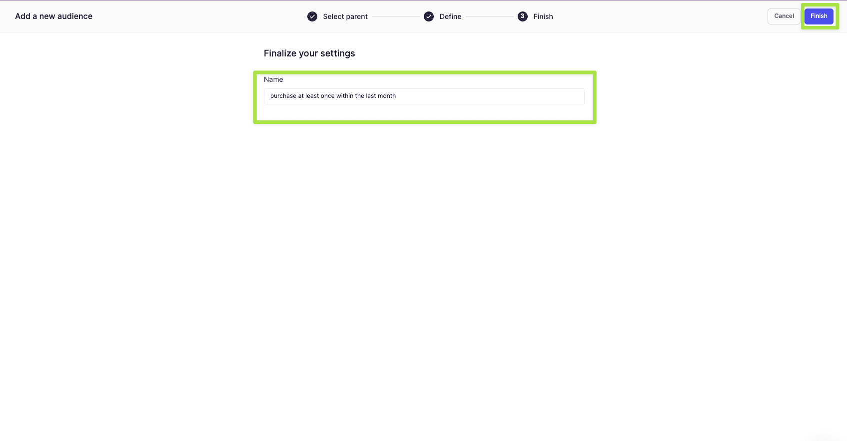 Build your Audience. Click Add Condition and select Have a Property. In this scenario, we're building an audience of users who have purchased at least one time within a month.