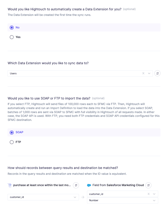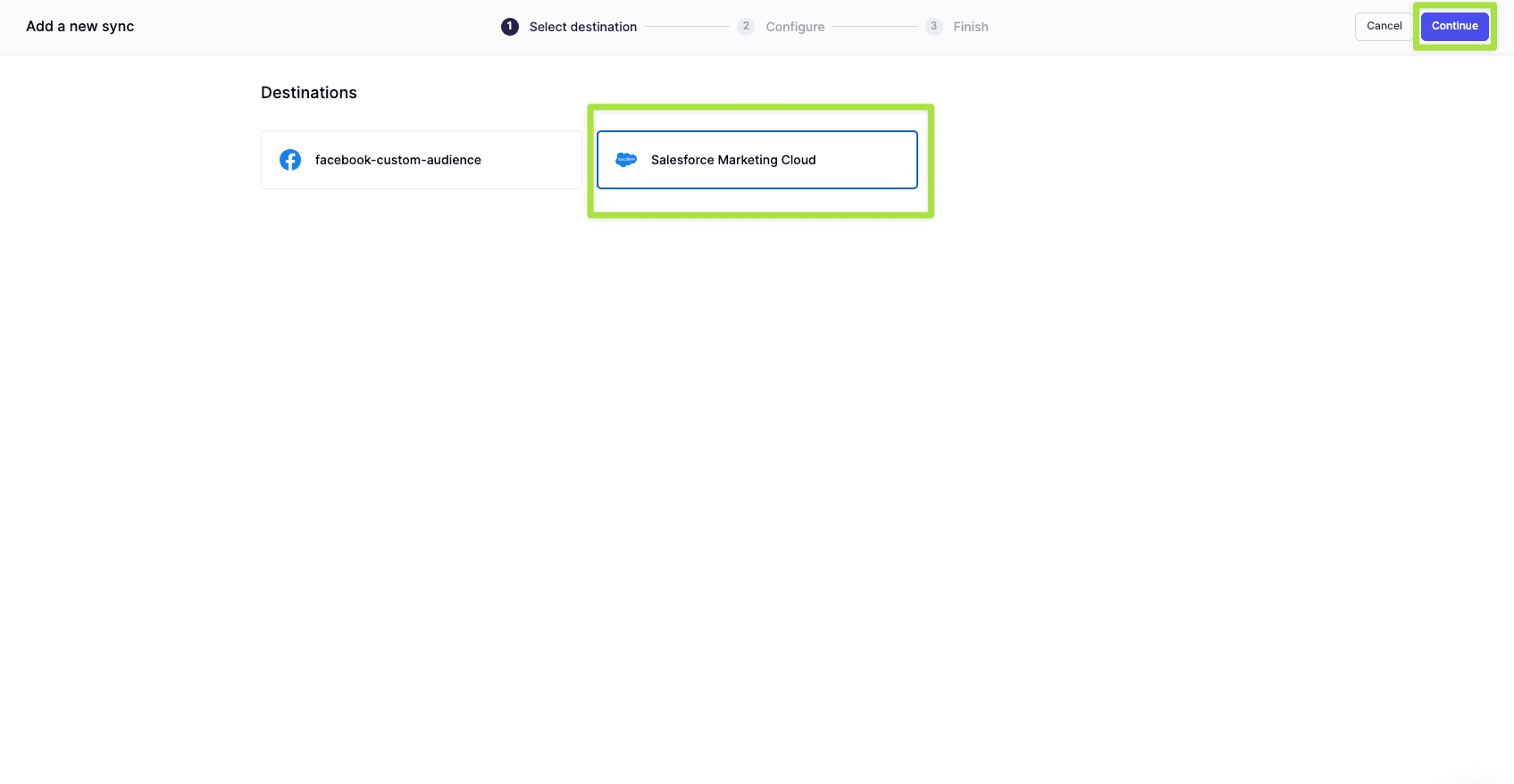 With the Facebook Custom Audience sync complete, it’s time to set up the Salesforce Marketing Cloud sync. Follow the same steps above to create a sync to Salesforce Marketing Cloud, except this time select Salesforce Marketing Cloud as your destination.