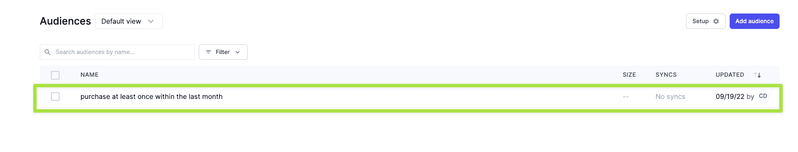 With your audience built, it's time to create your sync to Facebook and Salesforce Marketing Cloud. Click on the audience you've created. From there navigate to Syncs and click Add sync.