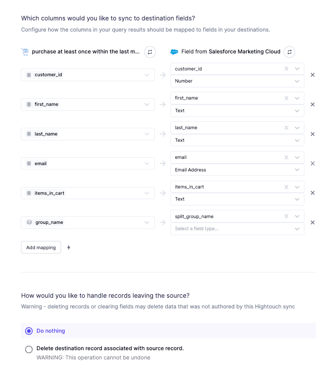 Select the Facebook Audiences destination that you set up and choose which columns you want to sync to Facebook. If you're dealing with PII data you can configure Hightouch automatically hash your data.