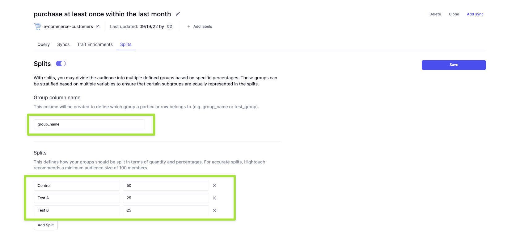 Using Hightouch, you can create your initial audience: people who have ordered something within the last month. Then, you can create your testing splits; Control, Test A, and Test B.