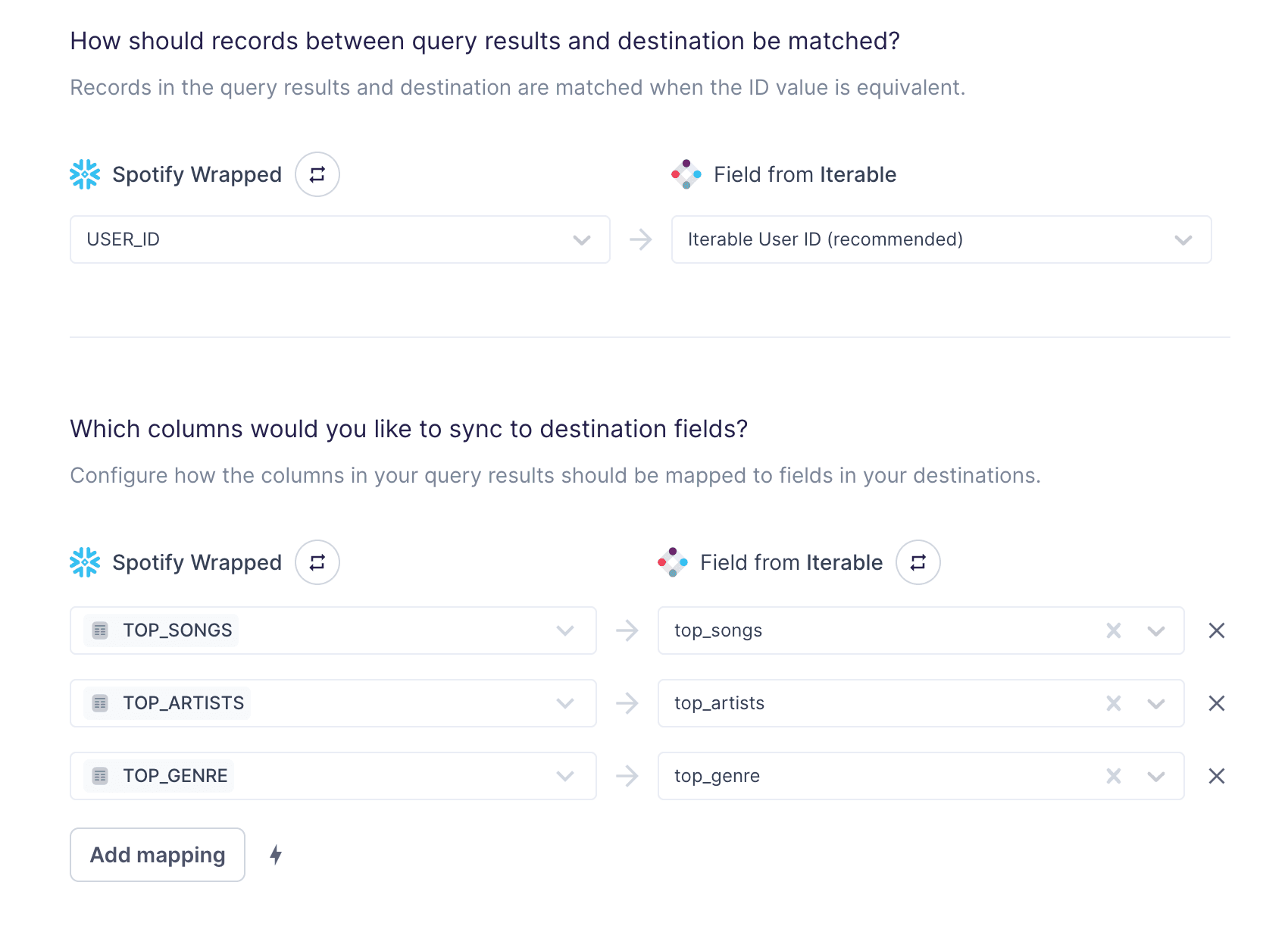 A sync is configured to map the data from the Source (Snowflake) to the Destination (Iterable). The Sync manages how Iterable will receive data as well as the frequency of the pipeline. When creating this sync, you'll need to define the fields you want to pull in from the model and how you want to map them in Iterable. That mapping could look something like this: